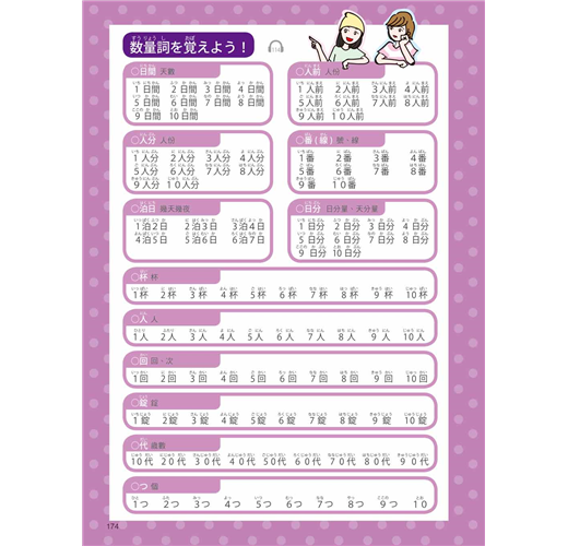 同時針對台灣人特別弱的「數詞」詳細地列表說明,例如: