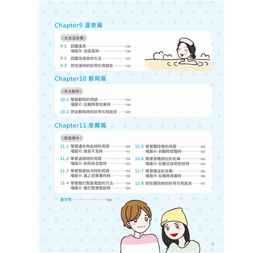 〈用餐〉〈遊賞〉〈參觀〉〈溫泉〉〈寄送〉〈急難〉11個單元。