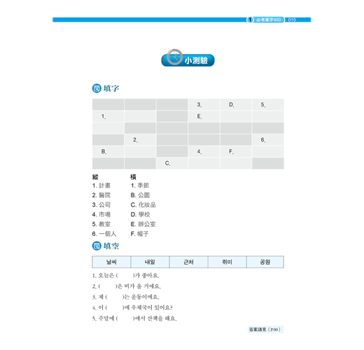 韓檢初級考試題型的另一趨勢,就是聽或看2~3句對話,甚至依圖案的內容來選主題或對話的地點等。因此,本單元是將第一單元沒有列出來的重要單字分成五個類別(場所、物品、人、興趣、自然環境),不但背單字,也能熟悉考題。