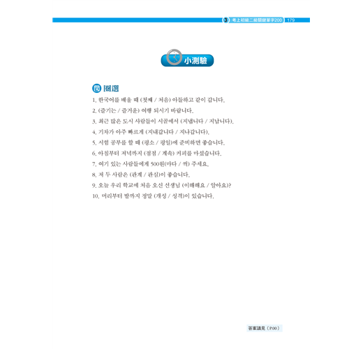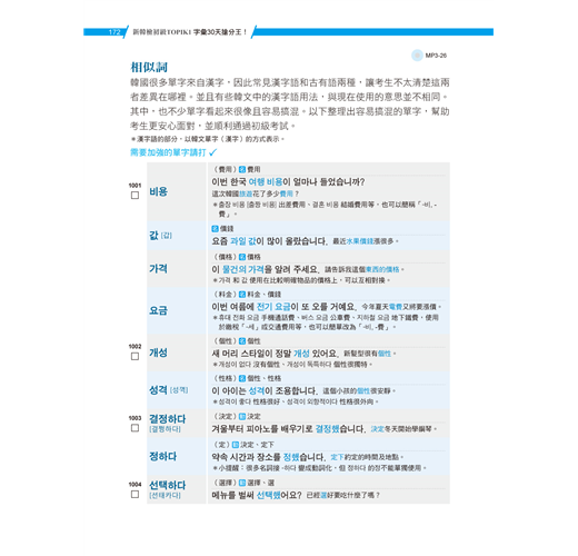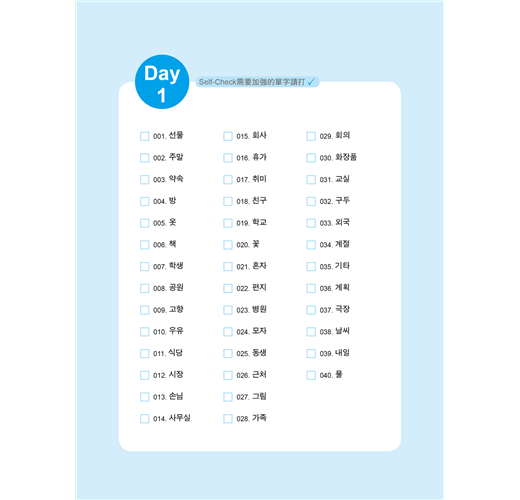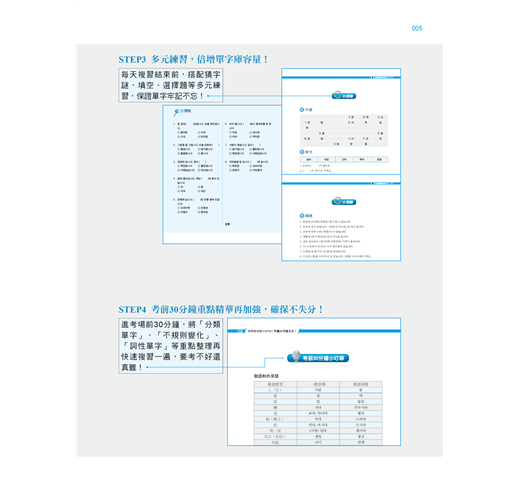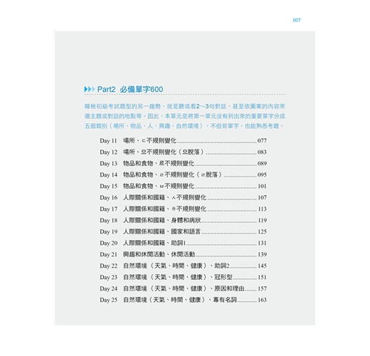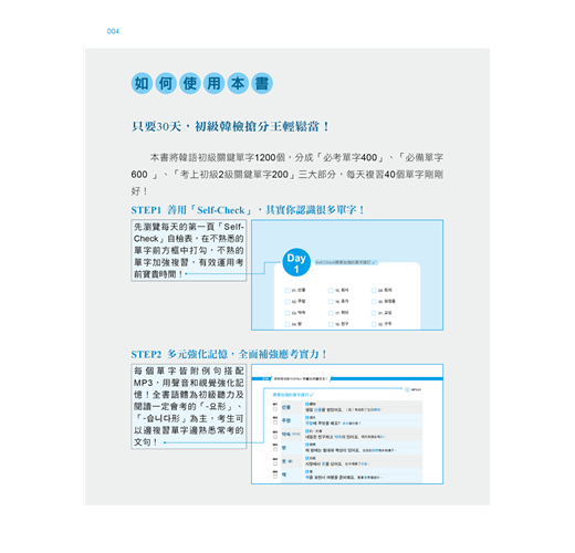 考前最忌諱一天捕魚三天曬網,然而我們明白,每天複習40個單字,一星期累積280個單字其實相當不容易,但基本功雖然辛苦卻也不得不做!如果已經學韓文有段時間或比較沒時間準備的考生,可先瀏覽每一天的第一頁「Self-Check」自檢表確認自己的實力,需要加強的單字打勾,再以MP3和例句強化記憶,最後搭配猜字謎、填空、選擇題等多元練習,倍增記憶庫容量!進考場前30分鐘,將「分類單字」、「不規則變化」、「詞性單字」等重點整理再快速複習一遍,要考不好還真難!