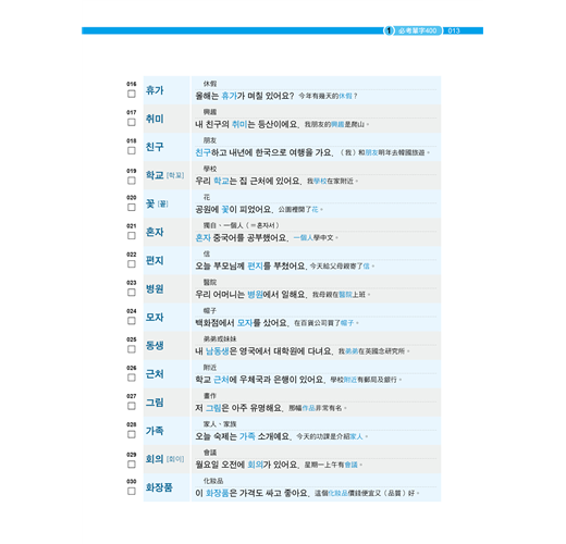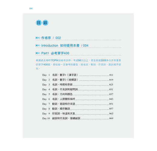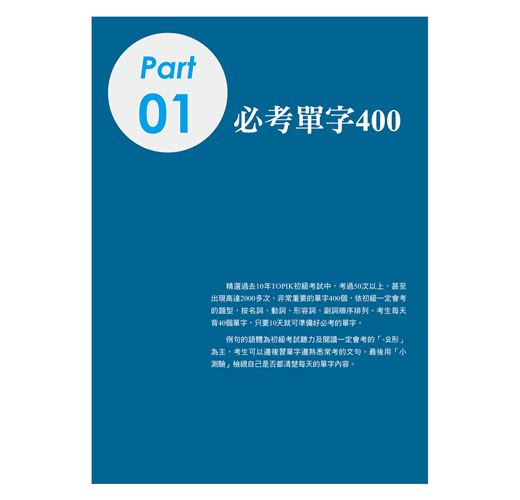 精選過去10年TOPIK初級考試中,考過50次以上,甚至高達2000多次非常重要的單字400個,依初級一定會考的題型,按名詞、動詞、形容詞、副詞順序排列。考生每天背40個單字,只要10天就可準備好必考單字。