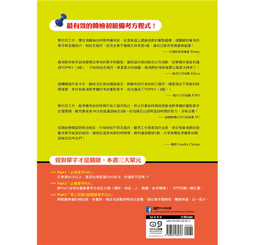 幸好,我已經有十年TOPIK考試的輔考經驗,手上完整整理出每回考古題的單字,為考生精煉關鍵初級單字1200個。Part1整理出考過50次以上,甚至出現2000多次的單字400個,依初級一定會考的題型,按名詞、動詞、形容詞、副詞順序複習,不必擔心遺漏重要單字;Part2是依據考試題型,將Part1沒有列出的600個重要單字,分成五大類(場所、物品、人、興趣、自然環境),邊背單字邊熟悉考題;Part3將較難準備的相似詞、多義詞、複合名詞、複合動詞、被動詞、使役動詞等200個單字加以統整,強化單字關聯性,無論遇到題目怎麼變化,都可以發揮以一抵十的效果,安心面對考試。