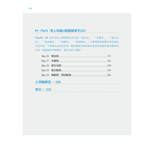 Part3「考上初級2級關鍵單字200」:將較難準備的相似詞、多義詞、複合名詞動詞等加以統整,強化單字關聯性,觸類旁通、以一抵十。