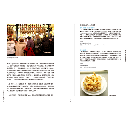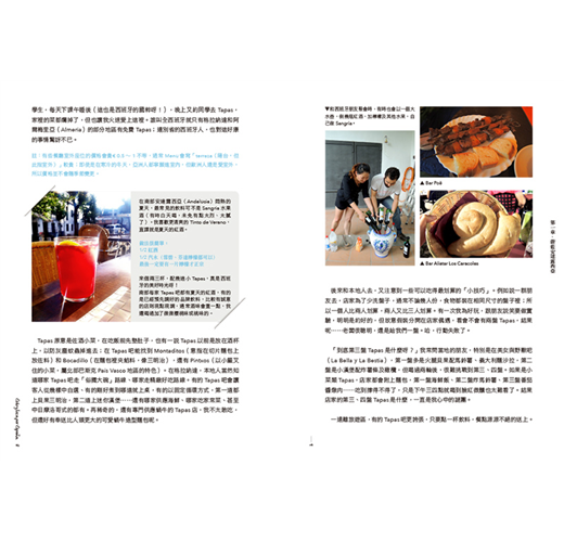 從南到北,上田莉棋帶領大家走一遍,不可錯過的Tapsa酒吧、值得參與的瘋狂慶典、令人驚嘆的建築巡禮、洗滌心靈的朝聖步行……她在不同城市交了當地朋友,並且在旅途中跟不同年齡不同職業的人聊天,記錄下這些一期一會的片刻,西班牙人的豁然跟幽默皆被她捕捉。