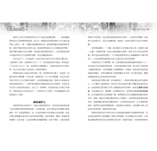 我相信是神在保守世界中的大企業或政府組織不受到教會的掌控,這是因為連我們自己對神國的了解也不夠透徹,所以神無法信任我們,以致無法讓我們執掌有能力和影響力的位置。換個角度說,若把我們教會的「經營模式」套用在一般企業中,大概絕大多數都無法存活。這不是指教會裡的人有問題,或是我們所做的不管用,只是有些在教會裡行得通的東西,一旦到了更大的格局就不見得適用,因為那些我們覺得管用的,也不見得就是天國的原則。