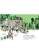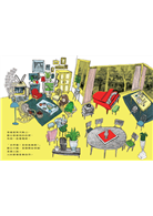在故事最後,酷比發現與創造音樂的場景非常精采。作者把酷比和奶奶洗碗盤的模樣拉近特寫。酷比用洗碗刷與匡啷匡啷的碗盤製造出音樂與一堆大大小小的泡泡,右腳還一邊打著節拍的模樣,實在是太可愛了!在蘋果綠的跨頁圖上,作者用將近半版的空間,以白色為主的字體展現泡泡嗶嗶啵啵,以及碗盤與泡沫相遇發出的熱鬧音響。多種不同的俏皮字體變化,更讓整幅畫面充滿動感與音樂!另外,酷比接著在屋裡屋外跑來跑去,收集製造音樂需要的各種器具,還實驗各種東西發出的樂音一幕,真的太好玩了。好多好多酷比忙著工作與試驗的身影,讓人簡直想一起跳進畫面中,加入這場創造音樂、乒乒乓乓的遊戲呢!