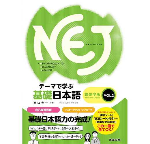『NEJ : A New Approach to Elementary Japanese-テーマで学ぶ基礎日本語 』是一本把以主題為主的語言教育應用到基礎日語教育的教科書。我們可以從兩個不同的觀點來探討語言知識。一是把語言看成符號系統,另一種是把語言看成語言活動典型的集合。傳統的基礎(初級)日語教科書採用前者的觀點。用這種方法學習日語,學習者在學完每課後,很難用日語進行溝通。『NEJ』用的是後者的語言觀點。用『NEJ』學習日語,學習者不僅能學會日語,同時從每個單元的學習裡,都會有一種〝用日語進行了某種交流〞的感覺,進而產生成就感。本教科書的編排讓學習者能夠有系統的學習日語與詞彙。
