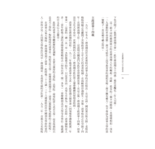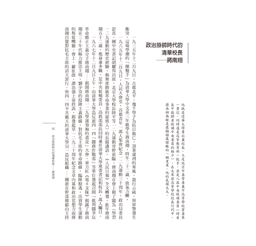 一九五二年冬天,蔣南翔出任共產黨時代清華大學的首位校長。在這之前,國民黨兵敗大陸,老校長梅貽琦隨之也離開了其執政達十七年之久的菁菁校園,在海峽對岸過餘生,其後,清華校長之位空缺了四年,直到蔣南翔上任―這說明有關部門為此任命曾頗費思量;在這之後,蔣南翔主政清華十四載,如果沒有文化大革命這一史無前例的大浩劫,蔣南翔在此位置上還會繼續居留相當時間。