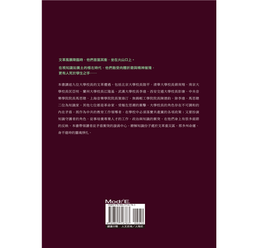本書講述九位大學校長的文革遭遇,包括北京大學校長陸平、清華大學校長蔣南翔、南京大學校長匡亞明、蘭州大學校長江隆基、武漢大學校長李達、西安交通大學校長彭康、中央音樂學院院長馬思聰、上海音樂學院院長賀綠汀、無錫輕工學院院長陳德鈞。除李達、馬思聰二位為知識家,其他七位都是革命家。受極左思潮的衝擊,大學校長的角色存在不可調和的內在矛盾,既作為中共的教育工作領導者,在學校中必須落實共產黨的各項政策;又要扮演知識守護者的角色,從事培養專業人才的工作。政治與知識的衝突,在他們身上有很多細節的反映。本書帶領讀者從矛盾衝突的漩渦中心,瞭解知識份子處於文革重災區,那多舛命運、身不逢時的靈魂掙扎。