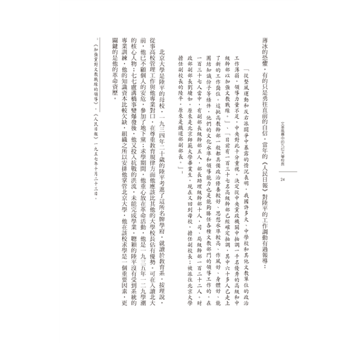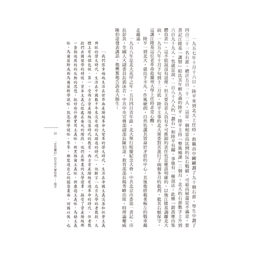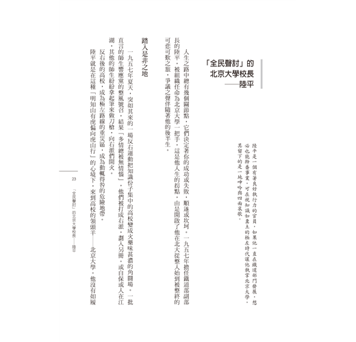 唐先生的風格是筆者所認同的。拙著所寫的九位校長都不完美,他們的權力含金量有天壤之別,他們的人生有成功有挫折有高峰有低潮,作為中國高等教育的領導者,他們在時代的夾縫中留下深深的印記。筆者以同理心來觀察九位校長的人生起伏,凸顯極左思潮對人性的扭曲對社會的危害。