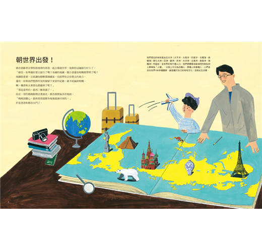 在充滿趣味的小知識間 輕鬆建立孩子的世界觀除了我們腳下的家鄉台灣外,在人類居住的地球上,還有許許多多其他的國家,面積大小不一、人種膚色深淺各異,四散分布在五大洲的土地上!而本書的內容,正是就讀小學的修浩,與在學校教地理的爸爸一同遊歷各國的環遊世界紀錄。兩人走訪了被色彩繽紛的楓葉所染紅的加拿大楓葉大道、富麗堂皇的法國凡爾賽宮、朝氣蓬勃的泰國水上市場等地。爸爸是修浩的優秀導遊,有條有理地為他講解世界各地的特色……