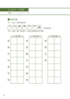 →本書練習欄位上印有九宮格紋,方便於對照示範文字之後,正確摹寫。首兩格還印有淺色示範文字的字樣,可先照著字樣摹寫兩遍後,再於九宮格上自行練習。從中習得書寫的感覺與重點。