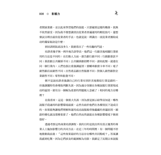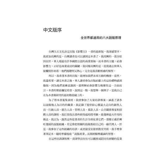 台灣久石文化決定出版《影響力》一書的最新版,我深感榮幸。我更加高興的是,台灣讀者也可以讀到這本書了。我高興的一部分原因在於,華人地區有許多國際公認的商業領袖,而本書的主題:社會影響力,正好是商業成功的關鍵。我同樣高興的是,從我過去與華人接觸來看,他們既聰明又熱心,完全是我喜歡相處的類型,