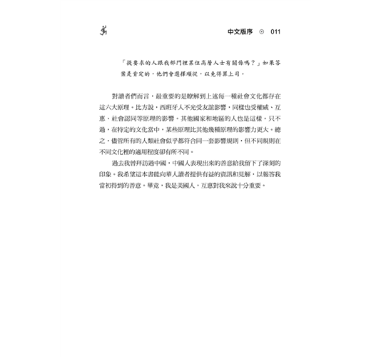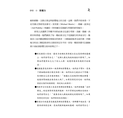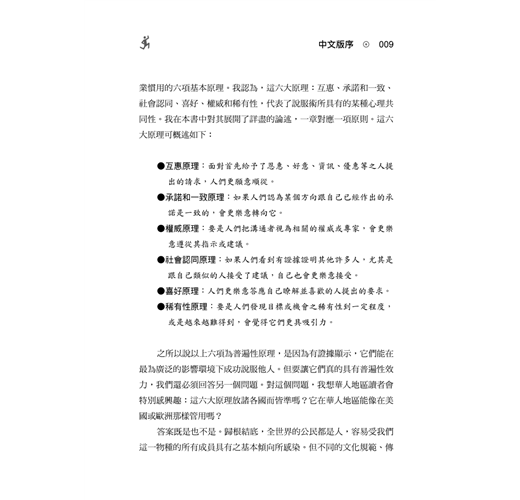 之所以說以上六項為普遍性原理,是因為有證據顯示,它們能在最為廣泛的影響環境下成功說服他人。但要讓它們真的具有普遍性效力,我們還必須回答另一個問題。對這個問題,我想華人地區讀者會特別感興趣:這六項原理放諸各國而皆準嗎?它在華人地區能像在美國或歐洲那樣管用嗎?