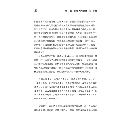 所以,我希望本書的出版,能增加我們未來互動的機會。當然,我還希望,讀完本書之後,華人讀者會為出版社獻上的這份禮物感到愉悅,因為他們逐漸意識到,就理解社會影響力複雜性這一方面而言,本書的幫助彌足珍貴。說到這一點,我想舉一個例子,是我自己在為本書做研究的最初階段碰上的。