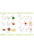 分為「早餐吃什麼」、「最愛的點心時間」與「蔬果最營養」三部份,教小朋友畫出自己最愛吃的食物、點心和水果!裡面有吐司先生、小豬棒棒糖、QQ珍奶,還有西瓜、草莓、鳳梨等各樣畫法呦!
