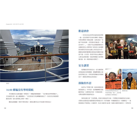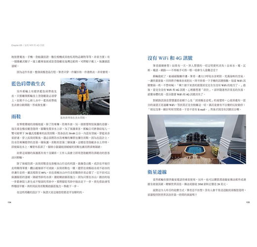 感覺上極境旅行會是忙碌、挑戰體力的。就踏步在南極大陸探尋時確實是這樣,但16天的行程包含:在飛機上含等機時間來回需要60多個小時、在郵輪上除了登陸南極大陸和一些周邊小島,一天有約10多個小時是在船上,若是一個人旅行,那表示這10多個小時多半得一個人在房間。誠懇建議攜帶幾本平時沒有空閒閱讀的書籍。