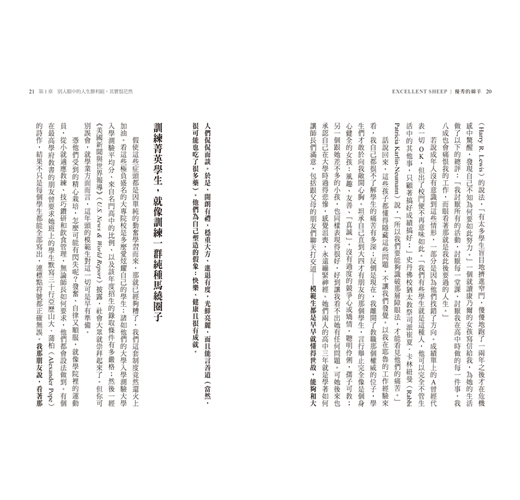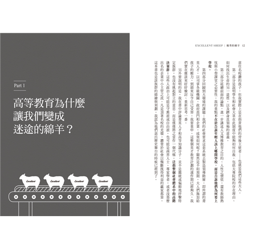 原來,「優秀的綿羊」指的正是菁英教育中那「茫然的一代」。正如同書中一位在最高學府教書的朋友,看到學生們倒背如流的默出文豪詩作、連標點符號都無誤時,感歎地說道,看到學生在課堂寫作業,就好像「看到一群純種馬在跑場上繞圈子」。