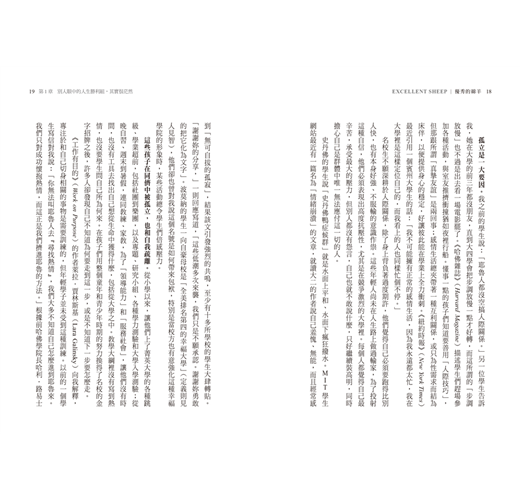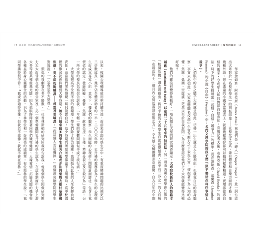 至於本書,例舉美國大學生的成長和求學心路歷程,其中扭曲的名校情結,以及名校生的盲目與茫然,台灣的讀者或許能夠想像。