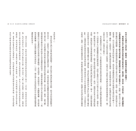 此書分為四個部分,首先是討論高等教育制度,如何局限學生的人生選項到只剩學習和成功擇一;教育顯示了社會價值觀,而它也同時傳遞著這套價值觀;我經常批評某些一心一意往名校鑽的孩子,但我實際上是在指責他們的背後主使者──也就是我們這些大人。