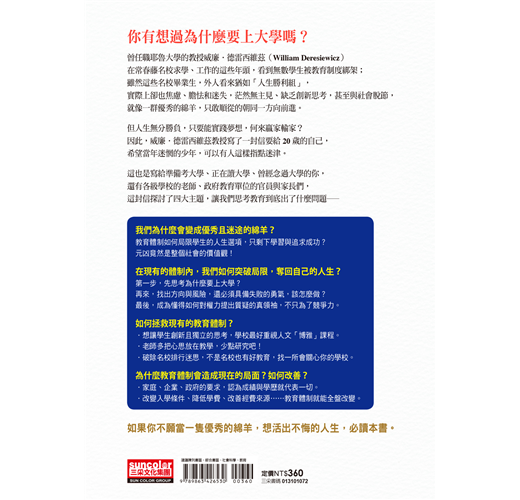 或許,每個人在上大學前,都該好好的讀一讀此書,思考自己究竟為什麼要上大學?上大學的意義在哪裡?然後,拒絕做一隻優秀的綿羊,活出不悔的人生。