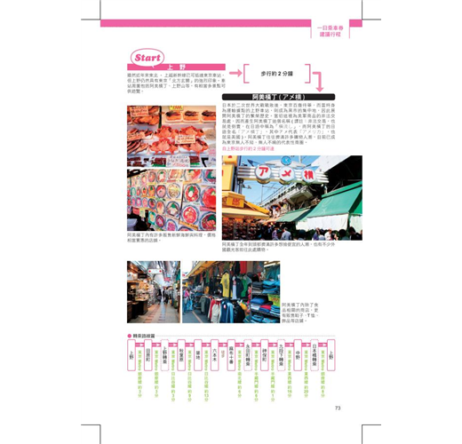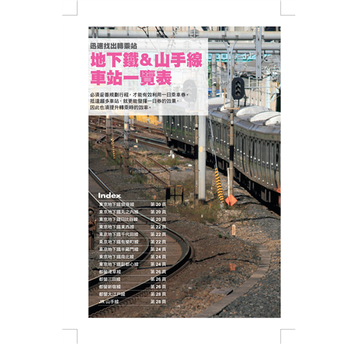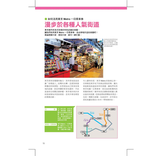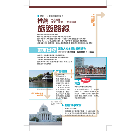 2.建議行程包羅萬象:除了介紹票種之外,依電車路線幫自助旅行者規劃出建議旅遊路線,景點圖文說明、遊玩順序、所需時間,一目瞭然、清楚實用。