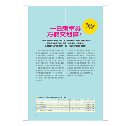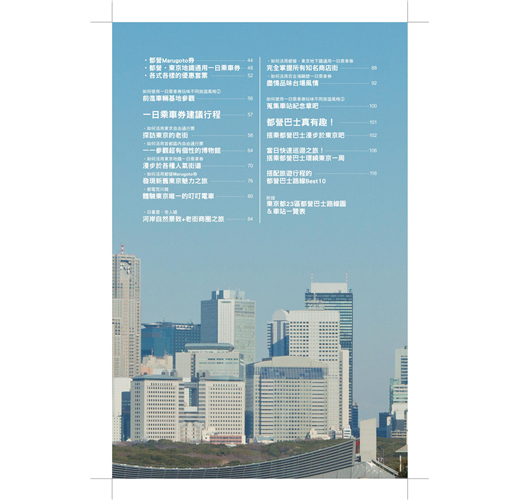 4.詳盡電車線與路線圖:本書含蓋東京地下鐵各站列表、各一日乘車券主要行駛地區圖及跨頁行程路線圖、各建議行程電車路線圖及車站轉乘表、都營巴士23區路線圖及各巴士系統停靠站,本書在手,玩東京不迷路、每人都是搭車高手。
