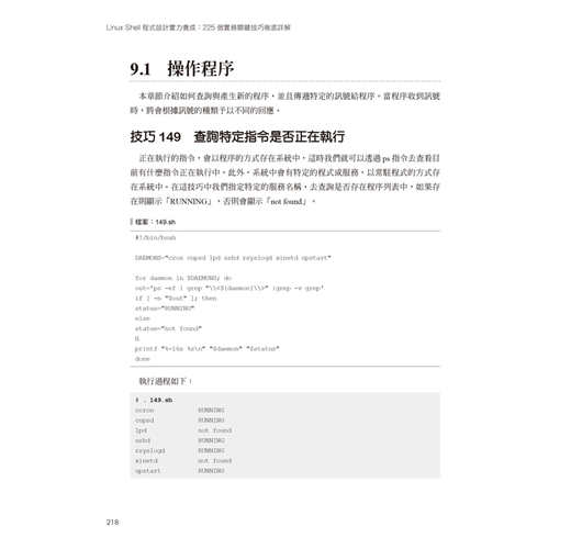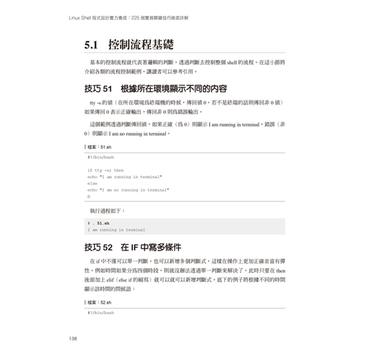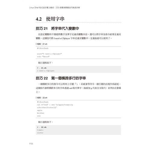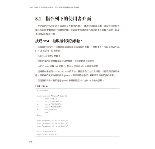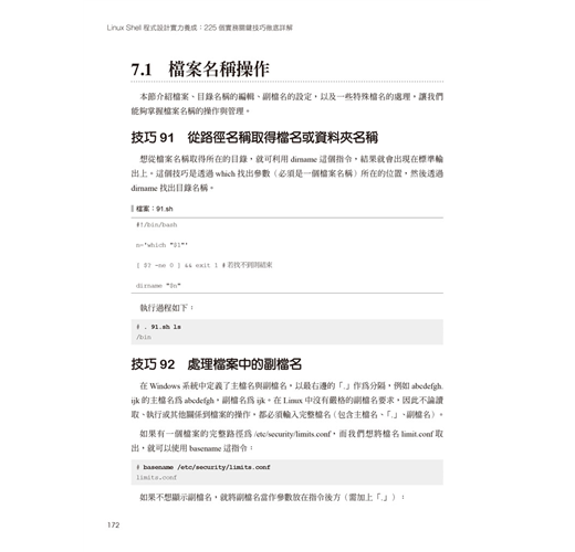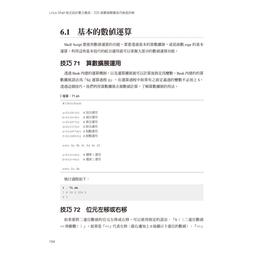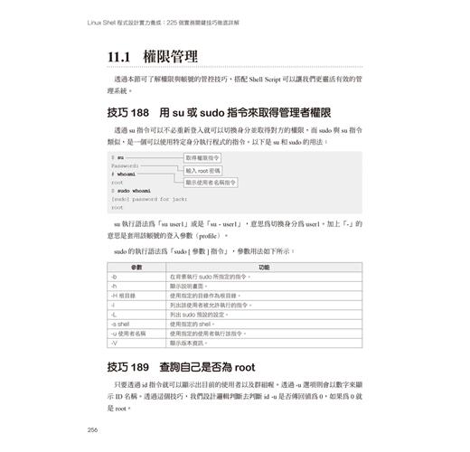 Shell Script並不是一個完全獨立的程式語言,而是指令的延伸語法與程式迴圈判斷的綜合工具,需要了解指令的用法與系統的架構,才能發揮它的效能。本書前2 章介紹指令用法、Bash的進階應用並延伸到Shell語法,讓讀者了解程式結構後,在後面的10個章節以225個實例上的技巧應用,來快速掌握 Shell Script的訣竅。