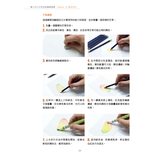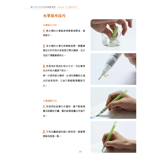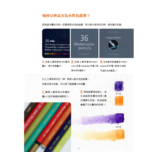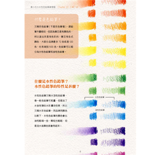 在工具介紹的單元將介紹各常見品牌水性色鉛筆的特點、水筆選購的重點、紙張以及其他繪畫工具的選擇,每種組合及變化都是一種風格,幫助讀者選擇符合自己喜好的工具!