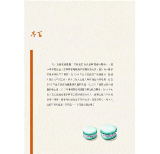 從小沒喜歡過畫畫(可能是因為沒被稱讚過的關係),國中畢業開始就進入五專學習電機電子相關知識的我,曾以為一輩子和電子業脫不了關係,在2008年生日前接到了裁員通知,超過9個月找不到工作,原本以為人生進入無所適從的黑暗期,但卻在2009年生日後因為畫畫讓我重新來過,2011年底就開始我的插畫教學生涯,2013年暑假開始開課量和學生數目暴增,2014年的收入正式超越我在電子研發工程師時期的收入,感覺上這八年來就像是一場夢,過著與以前完全不同的生活,但是很開心,每年人生都有新的進展,而現在⋯⋯小花居然要出書了!