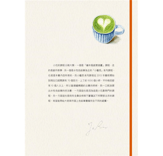 小花的課程分兩大類,一個是「繪本風創意插畫」課程,走的是創作教學;另一個是水性色鉛筆為主的「小藝思」系列課程,也就是本書內容所教的,而小藝思系列課程從2013年暑假開始到現在(2016.3)已經開課有70個班次,上了約1000個小時,平均每班都有10個人以上,所以當總編輯邀約出書的時候,我一口就說要出水性色鉛筆的技法書,一方面這也是因為這是小花最熱門的課程,另一方面這也是我完全靠自修與不斷嘗試下所開發出來的課程,希望能帶給大家與市面上色鉛筆書籍完全不同的感覺。