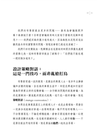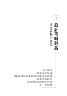 用畫筆切木頭/策略對話教父的教誨/創新:深入了解設計的力量/設計策略對話的五大核心原則/【核心原則1】 宣告目標→界定目的/【核心原則2】 確定參與者→融合多元視野/【核心原則3】 組合內容→建立問題框架/【核心原則4】 選擇場地→融合會場環境/【核心原則5】 排定議程→創造體驗/正確的工具有時是羅盤/設計理想會議:目標明確時正中靶心/成功的策略對話:在路徑不清楚時,找出你的方向/以核心原則為設計程序