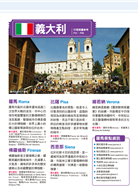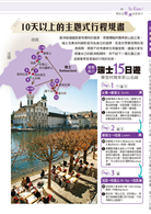 重要標示皆用明亮對比的顏色,讓讀者解讀清楚,一眼就看到重點。行程規畫以顏色區分天數和國家,利用簡單icon設計代替繁瑣文字,讓讀者簡單掌握要點,表格設計活潑,實用又簡易閱讀。
