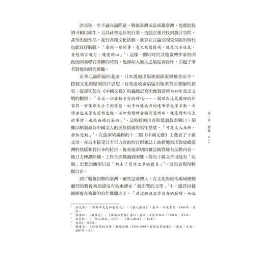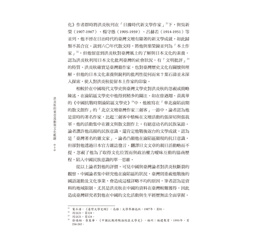 本書以橫跨東亞空間的整體與流動角度,觀察洪炎秋變動的文化身分軌跡,對洪炎秋的生平經歷有更全面的觀察,了解他在不同政權下文化位置的轉變與適應。以東亞流動的角度看洪炎秋,更能對洪炎秋這類半山文化人在戰後台灣的政治活動有更明確的體察與定位,能開展出更豐富的戰後初期研究視野。