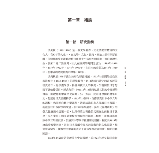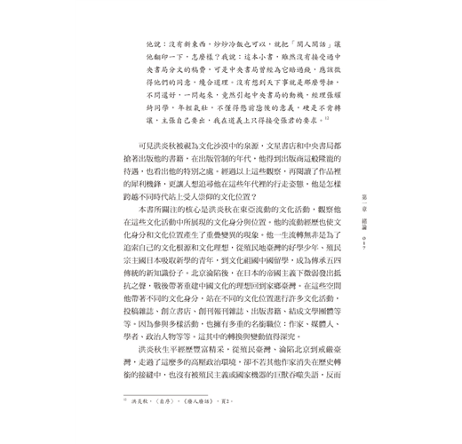 本書所關注的核心是洪炎秋在東亞流動的文化活動,觀察他在這些文化活動中所展現的文化身分與位置。他的流動經歷也使文化身分和文化位置產生了重疊變異的現象。他一生流轉無非是為了追索自己的文化根源和文化理想,從殖民地臺灣的好學少年、殖民宗主國日本吸取新學的青年,到文化祖國中國留學,成為傳承五四傳統的新知識份子。北京淪陷後,在日本的帝國主義下微弱發出抵抗之聲,戰後帶著重建中國文化的理想回到家鄉臺灣。在這些空間他帶著不同的文化身分,站在不同的文化位置進行許多文化活動,投稿雜誌、創立書店、創刊報刊雜誌、出版書籍、結成文學團體等等。因為參與多樣活動,也擁有多重的名銜職位:作家、媒體人、學者、政治人物等等。這其中的轉換與變動值得深究。