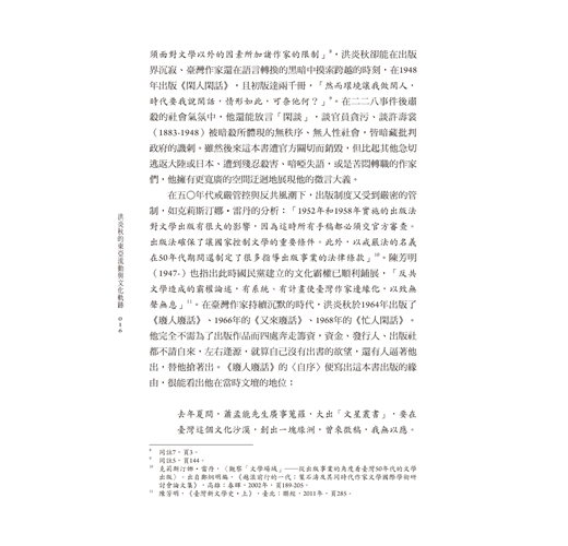 可見洪炎秋被視為文化沙漠中的泉源,文星書店和中央書局都搶著出版他的書籍,在出版管制的年代,他得到出版商這般隆寵的待遇,也看出他的特別之處。經過以上這些觀察,再閱讀了作品裡的犀利機鋒,更讓人想追尋他在這些年代裡的行走姿態,他是怎樣跨越不同時代站上受人崇仰的文化位置?