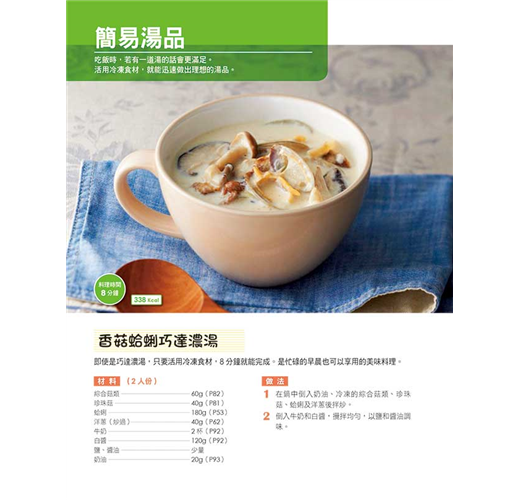46道活用冷凍食材的快速食譜,讓你在深夜回到家時,也能使用冷凍食材,迅速做出料理。填飽空虛的胃,溫暖身心靈。25道即使冷凍保存也不失風味的美味料理,只要在假日先準備好,就能讓冰箱變超市,儲備多樣美味佳餚,要吃時只要微波加熱便有好料理。