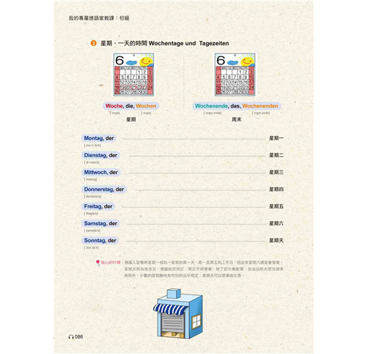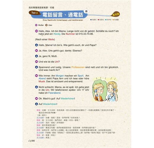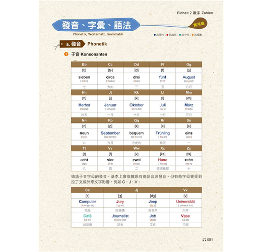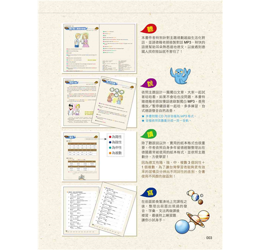 3,朗讀CD:「自修課本」中之基礎字母A-Z、變母音及德語單字、會話均由專業德籍老師親自錄音,從標準發音開始切入德語學習,事半功倍。