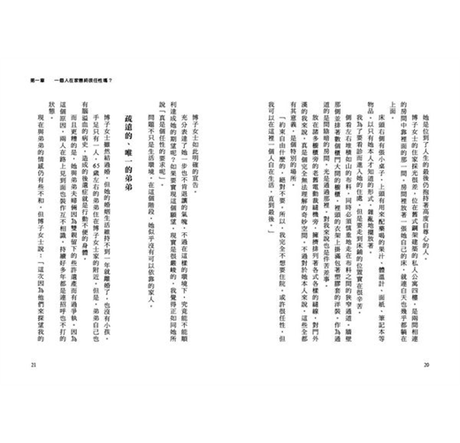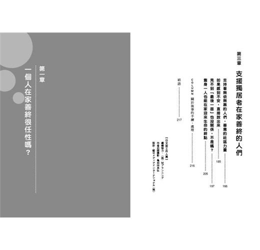 本書中介紹的患者,都是我與Pallium的工作人員實際接觸到,最後實現在家善終的人們。我在注意不能專指特定個人的同時,盡可能地忠實呈現該事例,挖掘其獨居緣由的問題,介紹全部的經過與最後。