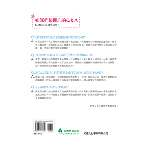 本書是Motherscat和讀者們一起構思出來的內容,收集了讀者們最想知道的點心製作Q&A,以及最受寶寶歡迎的點心種類,教你輕鬆製作無添加點心:食物泥、濃湯、果凍、布丁、果醬、鬆餅、蒸菓、羊羹、可麗餅、法式烘餅、餅乾、奶酥、奶凍……等,近200道營養點心。