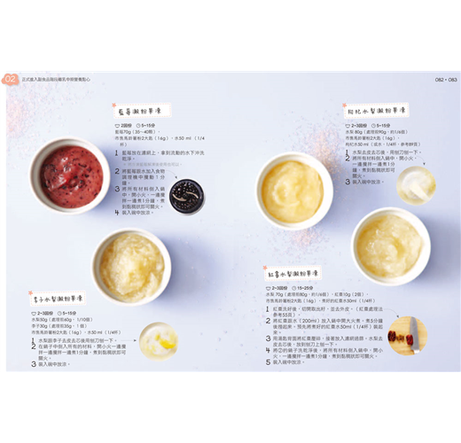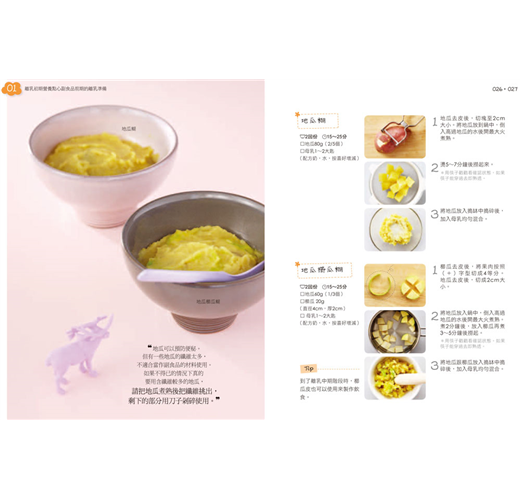 本書的點心配方會混入香蕉、哈密瓜、地瓜、南瓜等香甜的營養食材搭配,都是寶寶最喜歡的味道,讓不愛吃飯的寶寳