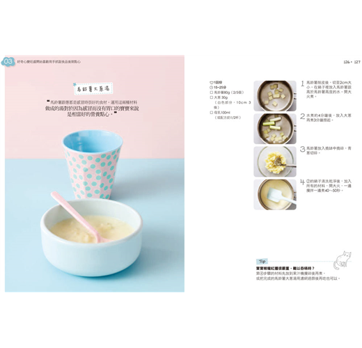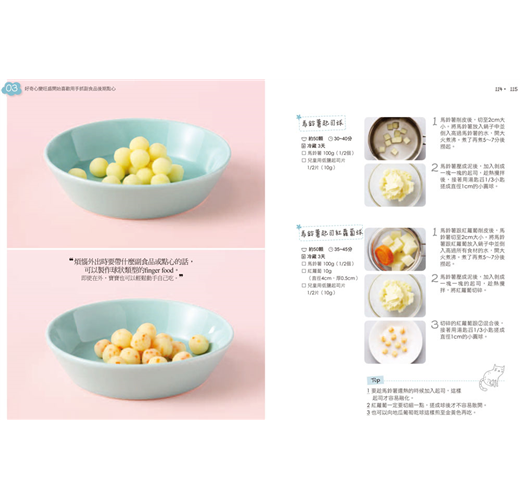 讀者心得5:「以前都是拿市售的米餅給寶寶墊肚子,這本書有一歲以下根據月齡的點心,製作過程的照片和文字都很容易理解,食譜的TIP提示也很貼心。」