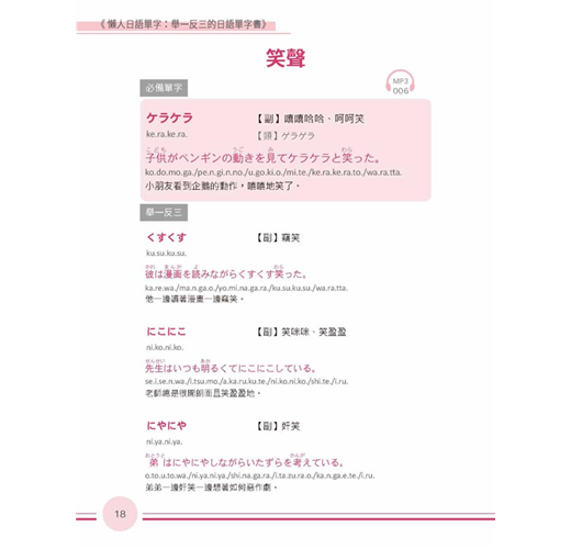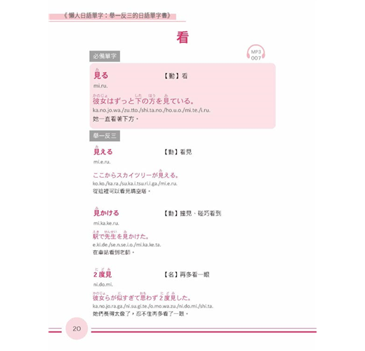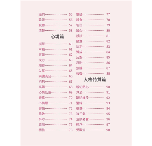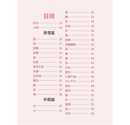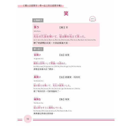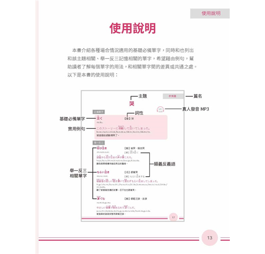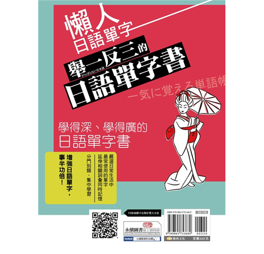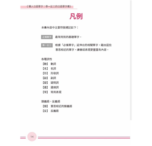 活用日語不詞窮瞬間充實日語單字力!一次背齊用得到的日語單字背單字不再是「點」的記憶本書將同關的詞彙串成「線」觸類旁通讓腦中單字「面」更寬廣,配合精選例句熟悉活用方法同時磨亮單字及會話兩樣溝通利器學得深、學得廣的日語單字書,嚴選日常生活中最常使用的單字,延伸相關詞彙同時記憶分門別類、集中學習增強日語單字,事半功倍