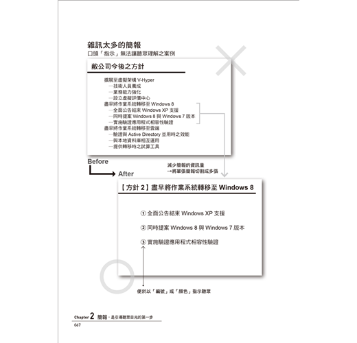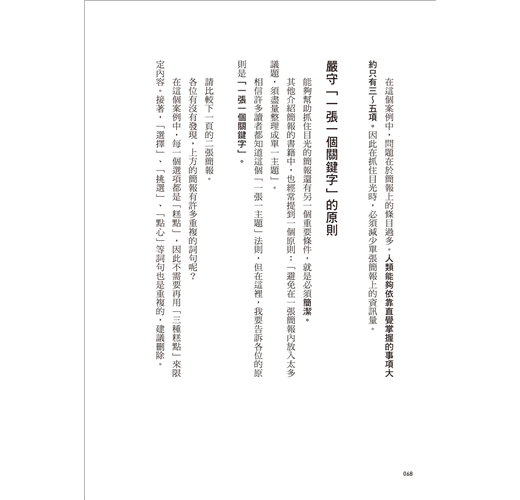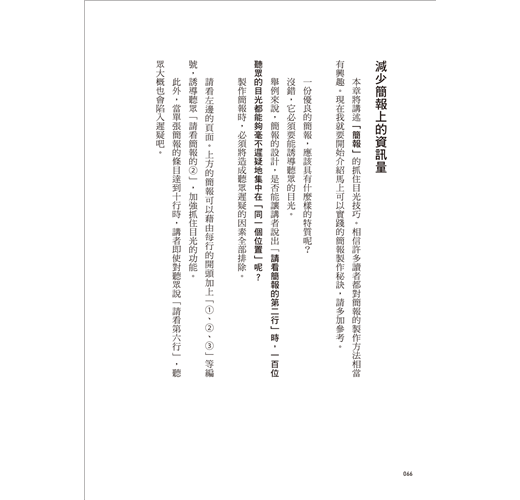 2. 簡報技巧超實用:一張一個重點、顏色不要超過3種、善用「留白」、想強數字時,單位縮小約20%等方法簡單易執行。
