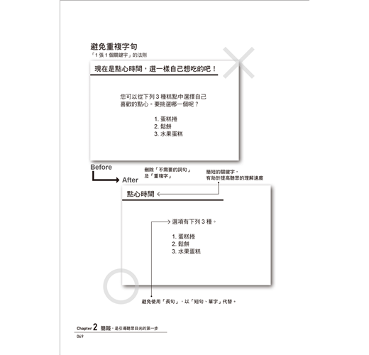 不是簡報的圖表多、數據多,更不是顏色豐富,而是「不讓聽眾『東張西望』」