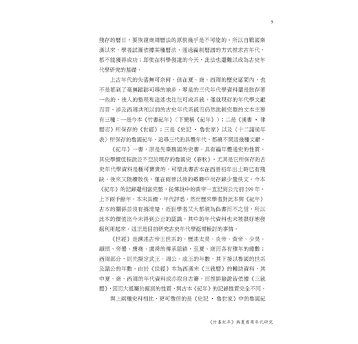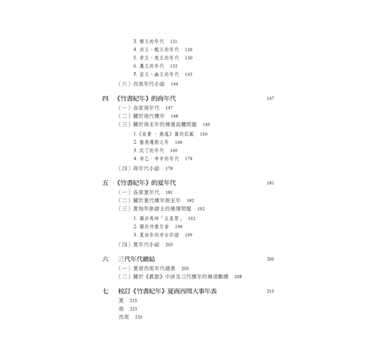 此下三篇分別考求三代的年代,但採取了由近及遠的編排,先西周,後商、夏,這也是歷來研究三代年代的一種習慣,亦即由已知推未知的一種程式。所有討論皆以《紀年》為主,然又不限於《紀年》,大凡前人的研究成果及相關爭議亦據所知擇要入之,故可看作是對三代年代學的一次綜合探討。所得結果仍落實於古本《紀年》,而這結果也就代表了作者目前對三代年代的一種基本看法。最後編錄了〈校訂《竹書紀年》夏商西周大事年表〉一篇置後,稍備一格,以存息壤之念
