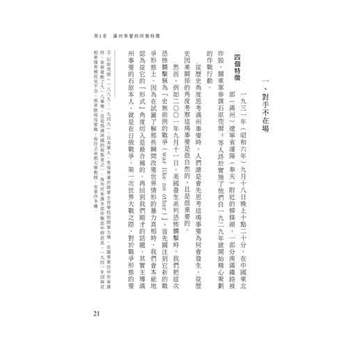 然而,例如二〇〇一年九月十一日,美國發生系列恐怖襲擊時,我們把這次恐怖襲擊稱為「史無前例的戰爭(war like no other)」,首先關注到它新的戰爭形態上。因為在試圖了解那些瞬間改變世界情形的暴力真相時,我們會本能地認為從它的「形式」角度切入是最合適的。再回到我們剛才的話題,其實主導滿州事變的石原本人,就是在日俄戰爭、第一次世界大戰之際,對於戰爭形態的變化和特徵有著最為縝密研究的人物。