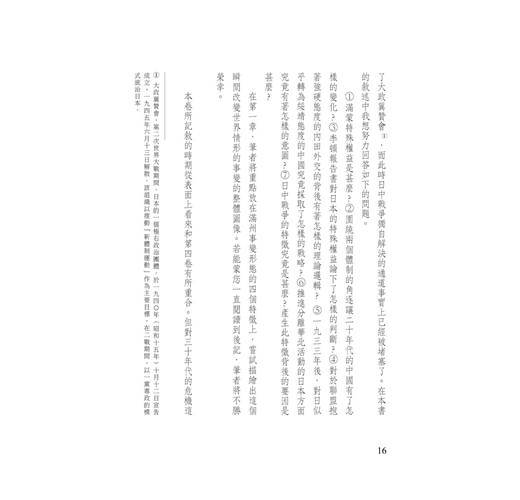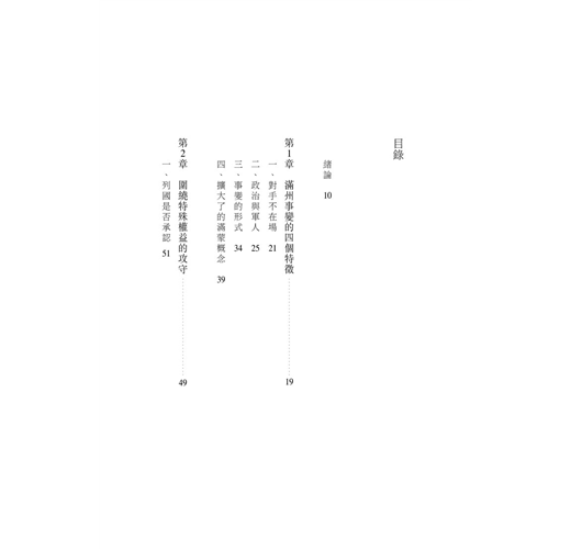 本書一方面將滿州事變的起源追溯到二十年代,必要時追溯到日俄戰爭時期。另一方面,也將敘述的時期向後定為一九四〇年十月,這一時間點日本成立了大政翼贊會,而此時日中戰爭獨自解決的通道事實上已經被堵塞了。在本書的敘述中我想努力回答如下的問題。