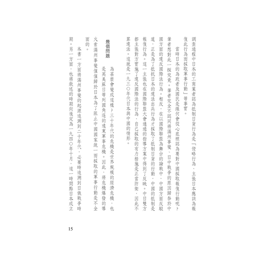 當時日本的為政者及國民是緣何會從心底裡認為要對中國採取報復行動呢?筆者想對此一探究竟。筆者完全不認同將滿州事變、日中戰爭的原因歸咎於中國方面的違反國際法行為。相反,在以國際聯盟為舞台的論戰中,中國方面反駁道,正是為了抵抗日本的違法出兵行為才採取了抵制日貨的行動,中國的抵制是報復行為。這一主張也在國際聯盟大會通過的指導方案中得到了反映。中日雙方都主張對方實施了違反國際法的行為,自己採取的有力措施是正當防衛,因此不算違法。這就是一九三〇年代日本與中國的情形。