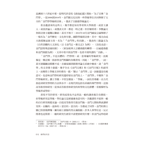 因為沒有人幫忙寫序,只好自己讚美自己。要弄出這樣一本書真的不容易,聰明才智還在其次,最苦的是時間與體力。在一個「視茫茫、髮蒼蒼、齒牙動搖」的年紀,手指頭常不聽使喚,鍵盤愈敲愈無力,想好的句子會突然忘記,一旦停頓之後,就再也接不下去。這本書的部份章節是在教授休假時所寫,回來上課後就再沒去理它,一放就是兩年,以致很多資料未及時更新。不過,話說回來,金門學術研究,新人不時冒出頭,作品累積的程度,遠超過我翻書的速度,我再怎麼努力也追不上他們的進度。